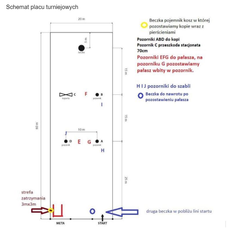 Wjazd w strefe zatrzymania 3mx3m Wytyczona przez linie z wapna na ziemi lub przez drążki leżące na ziemi. Odłożenie kopi wraz z pierścieniami do beczki znajdującej się na prawo od strefy zatrzymania. Wyjazd z strefy zatrzymania. Gonitwa z pałaszem